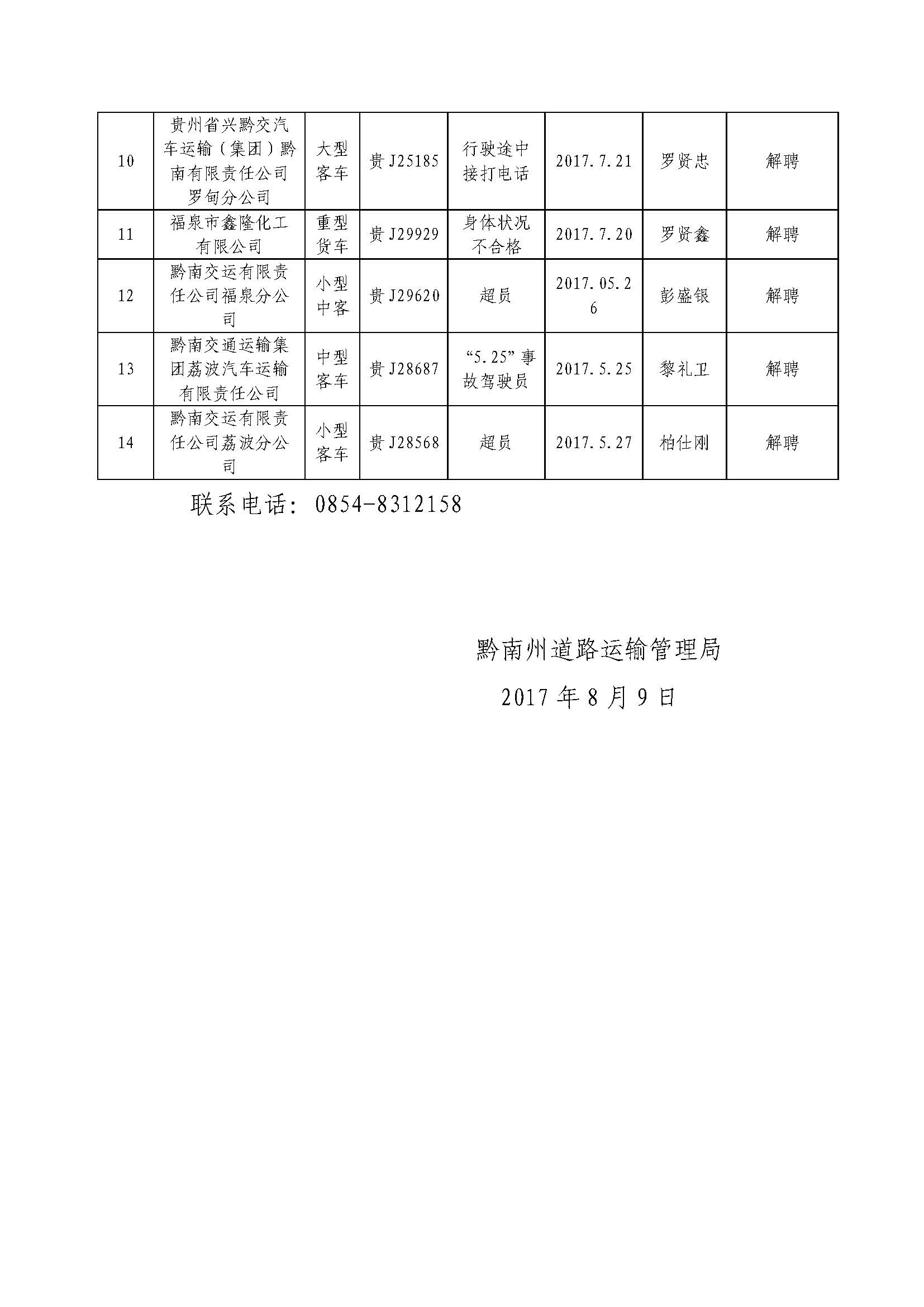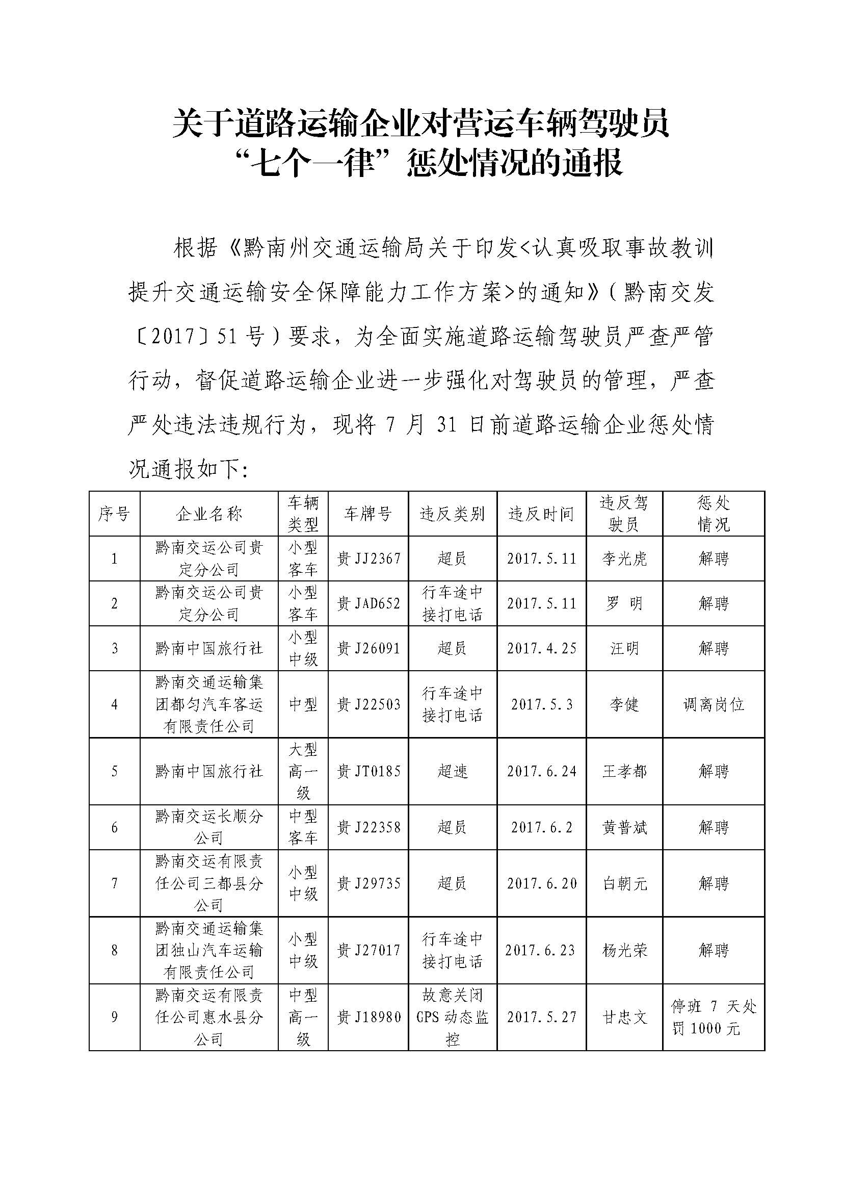 黔南州道路运输管理局关于道路运输企业对营运车辆驾驶员“七个一律”惩处情况的通报